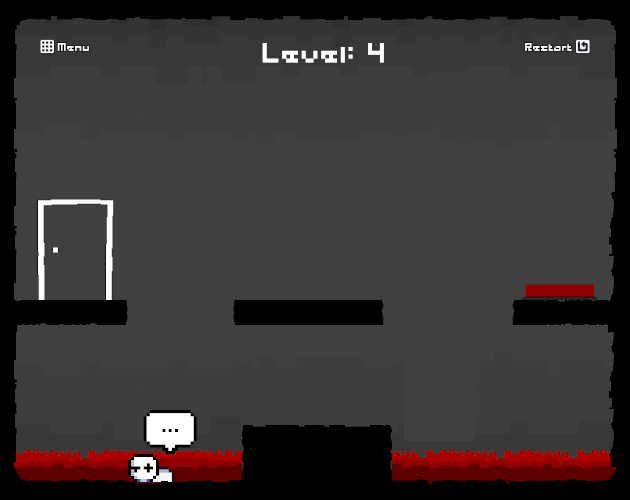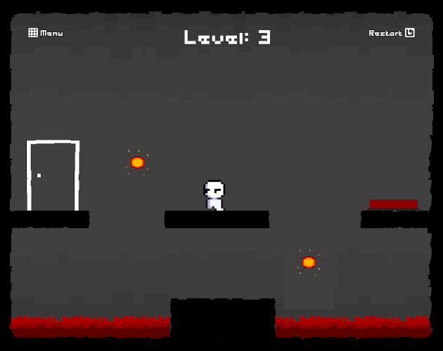 10 Quick Levels: Hit the button to spawn the door, then haul ass back in 6 seconds before it ghosts you. Spikes, pits, and fiery red (#8f0000) lava and fireballs get nastier each level.